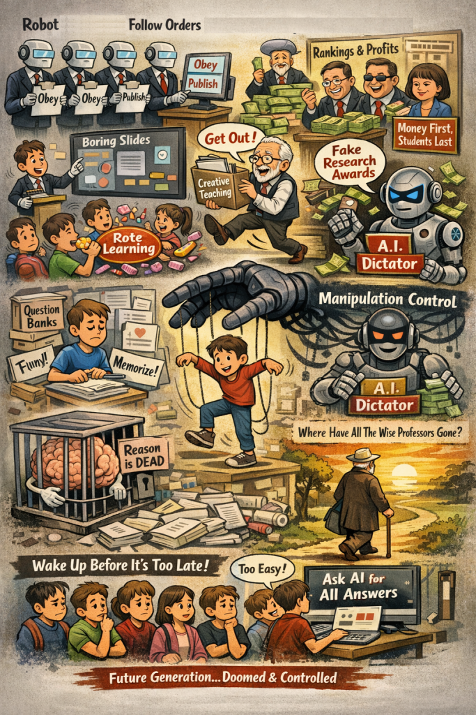 This approach leads students to stop using their reasoning abilities and become addicted to the “candy” of rote learning. They often resent authentic teachers who genuinely teach because such teaching requires them to think. If a generation cannot think, someone else will think for them—and that leads to manipulation and control by AI and others.